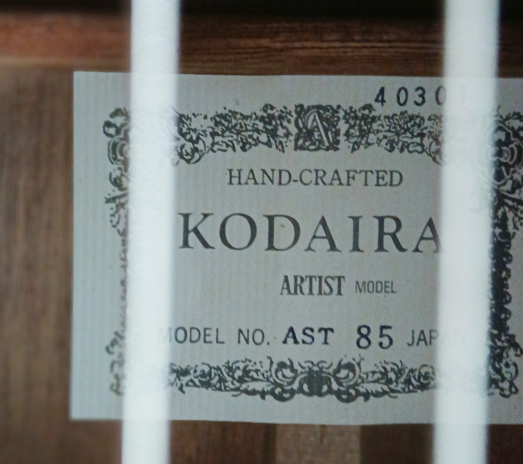 The AST-85 features the same artistic three-peak headstock design as the AST-100, with sharp outer peaks and a rounded, prominent centre peak. A black-and-white decorative wood inlay is set between the headstock and the faceplate, prominently visible in the bevelled lower section of the slotted head.