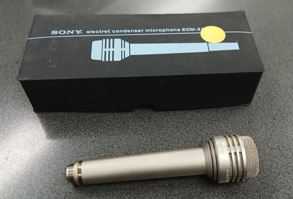 ECM-250 Sony Electret Condenser Mic (The Sony ECM-250 is a vintage 1970s electret condenser microphone known for its cardioid pickup pattern and small diaphragm. It operates on a single AA battery for power, requiring no phantom power, and is a low-impedance, all-metal construction microphone. Its applications include vocals, guitar cabinets, and drums.