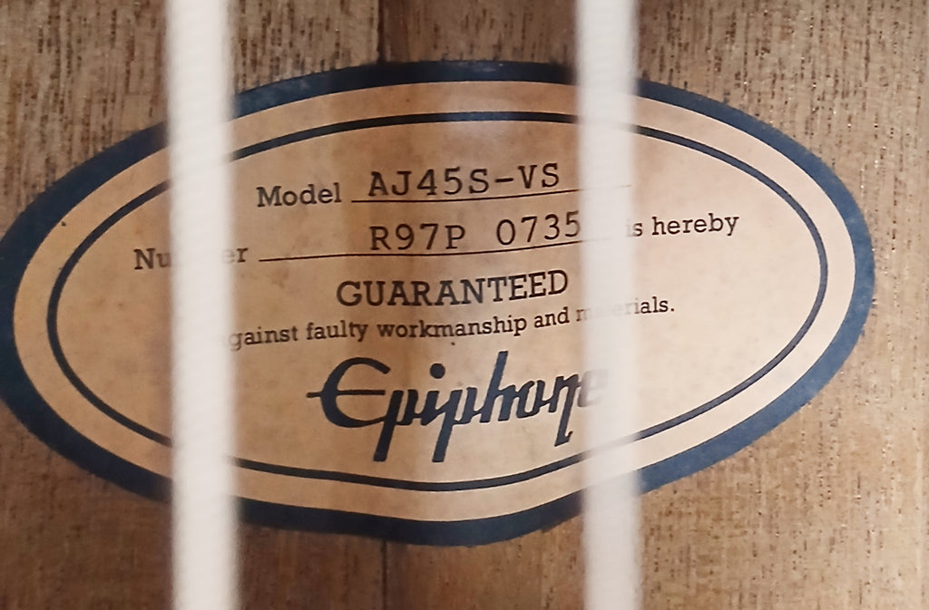 Epiphone AJ-4S-VS5, a model produced in the 1990's, which feature a solid top (typically spruce) and be part of Epiphone's solid-top acoustic line from that era.